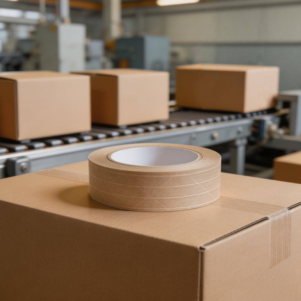 If you look closely at the specs, it features a robust double-layer kraft paper backing (40 g/m² on top, 40 g/m² on the bottom). Woven inside that paper sandwich is a fiberglass reinforcement grid. This gives the tape a massive tensile strength of 200 N/25mm (45 lbs/in). To put that in plain English: if a heavy box shifts or drops during transit, the fiberglass absorbs that shock so the tape doesn't snap.